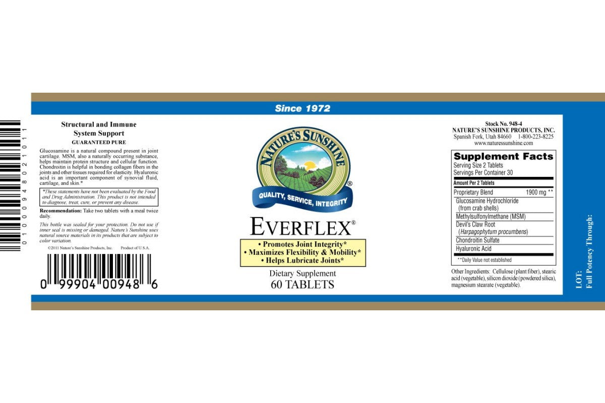 Formulated to help maintain joint mobility, EverFlex provides important nutrients which are the building blocks for healthy cartilage in joints. Cartilage is the ‘shock absorber’ for the joints, protecting bone from wear and tear. Nature’s Sunshine’s EverFlex® formula offers the combined benefits of three key ingredients: glucosamine, chondroitin and MSM, in one convenient tablet.